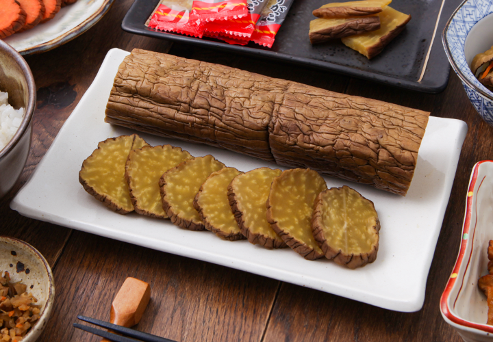 秋田県特有の食文化のひとつである「いぶりがっこ」。しっかりと煙で燻された大根を、秘伝の漬け床で熟成・発酵させて作られた大綱漬は、創業以来、多くのお客様に愛されてきました。パリパリの歯ごたえと甘めの味付けが特長です。